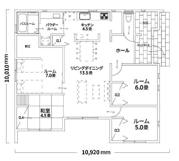 平屋の3LDKプランである1210は、リビングの両サイドにお部屋がありゆったりとした造りです。