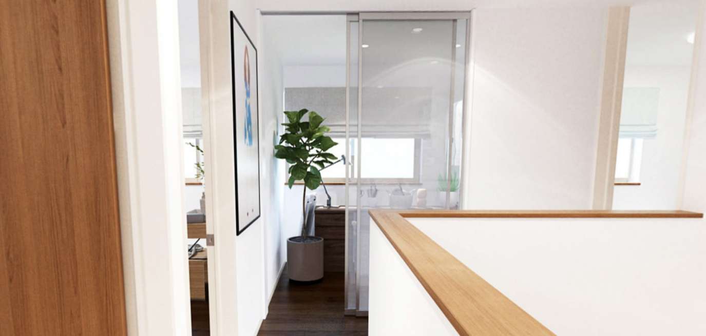 Aシリーズ最大の平米数。1、2階を繋げる階段は家の中央に設置。家事動線、水回りの導線を考慮しています。