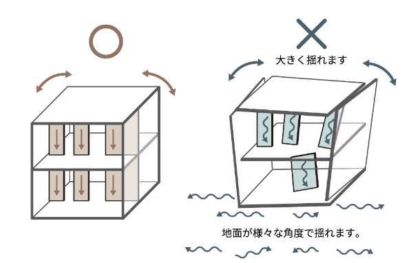 地震に強い家づくりを実現する為に、建築基準法の耐震基準 だけでなく「耐力壁直下率60%以上」「壁量充足率(地震力) 1.75以上」といったジブンハウス独自の耐震基準を設けてます。