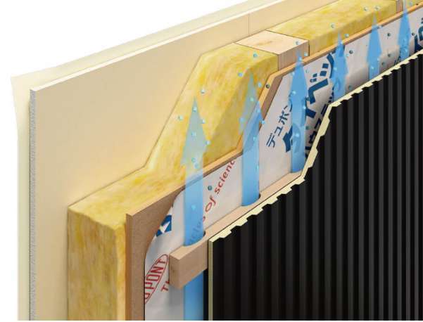 この方法は、壁体内の湿気を透湿防水シートという材料で壁を覆い、外壁材との間に外気が流れる層をつくることによって、壁内の湿気を透湿防水シートから通気層を通して外部に放出する方法です。