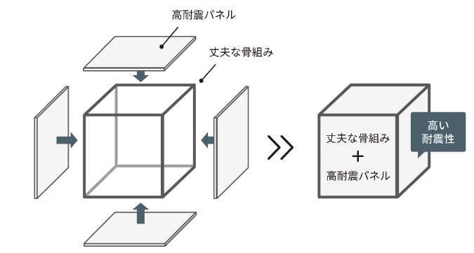 「丈夫な骨組み」と「高耐震パネル」によって構成された「あんしん構造」とする事で建物の長期耐震性・耐久性を確保しています。